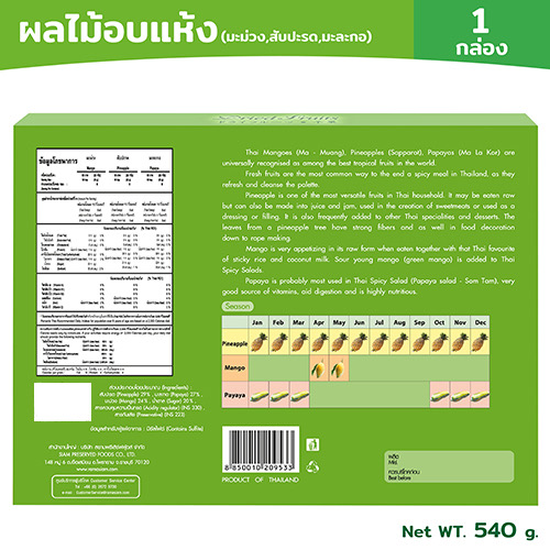 ข้อมูลผลิตภัณฑ์: ผลไม้อบแห้ง ตราสยาม ได้ผ่านการคัดสรรวัตถุดิบอย่างพิถีพิถัน ผลิตด้วยกรรมวิธีที่ทันสมัย เพื่อให้ได้สินค้าที่มีคุณภาพ บรรจุลงในบรรจุภัณฑ์ที่ได้รับมาตรฐานและสวยงาม เพื่อให้สินค้าคงความสดใหม่จนถึงมือผู้บริโภค